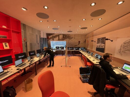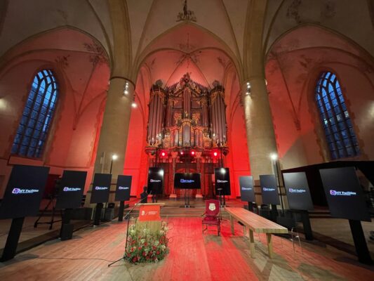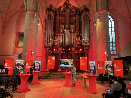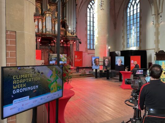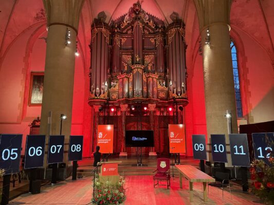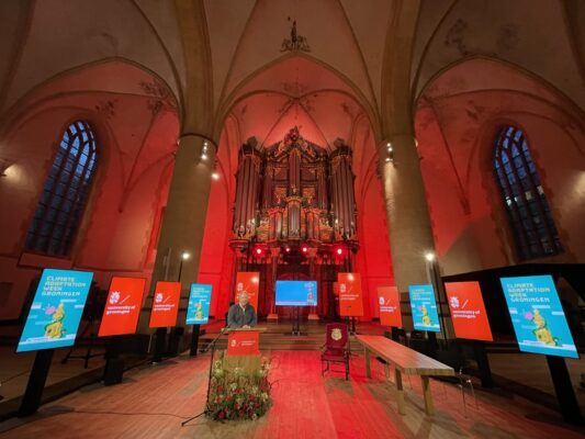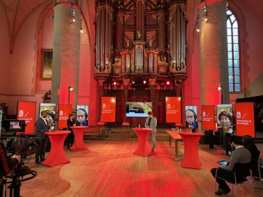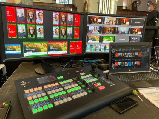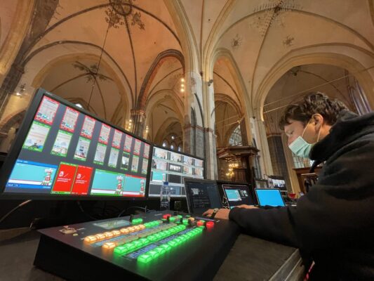 Voor de Climate Adaptation Week hebben we in een week tijd ongeveer 50 livestreams uitgezonden. In de control room van Forum Groningen zaten onze technici gedurende vijf dagen om alle livestreams aan te sturen in en rondom Forum Groningen. Op vrijdag vond de hoofdlivestream plaats vanuit de Martinikerk, waarbij Twan Huys als presentator in gesprek ging met verschillende eredoctoraten van over de hele wereld, waaronder Ban Ki-moon. Op de verschillende schermen werden in portretmodus de sprekers getoond. Een uitstekende klus voor onze Analog-way Aquilon.